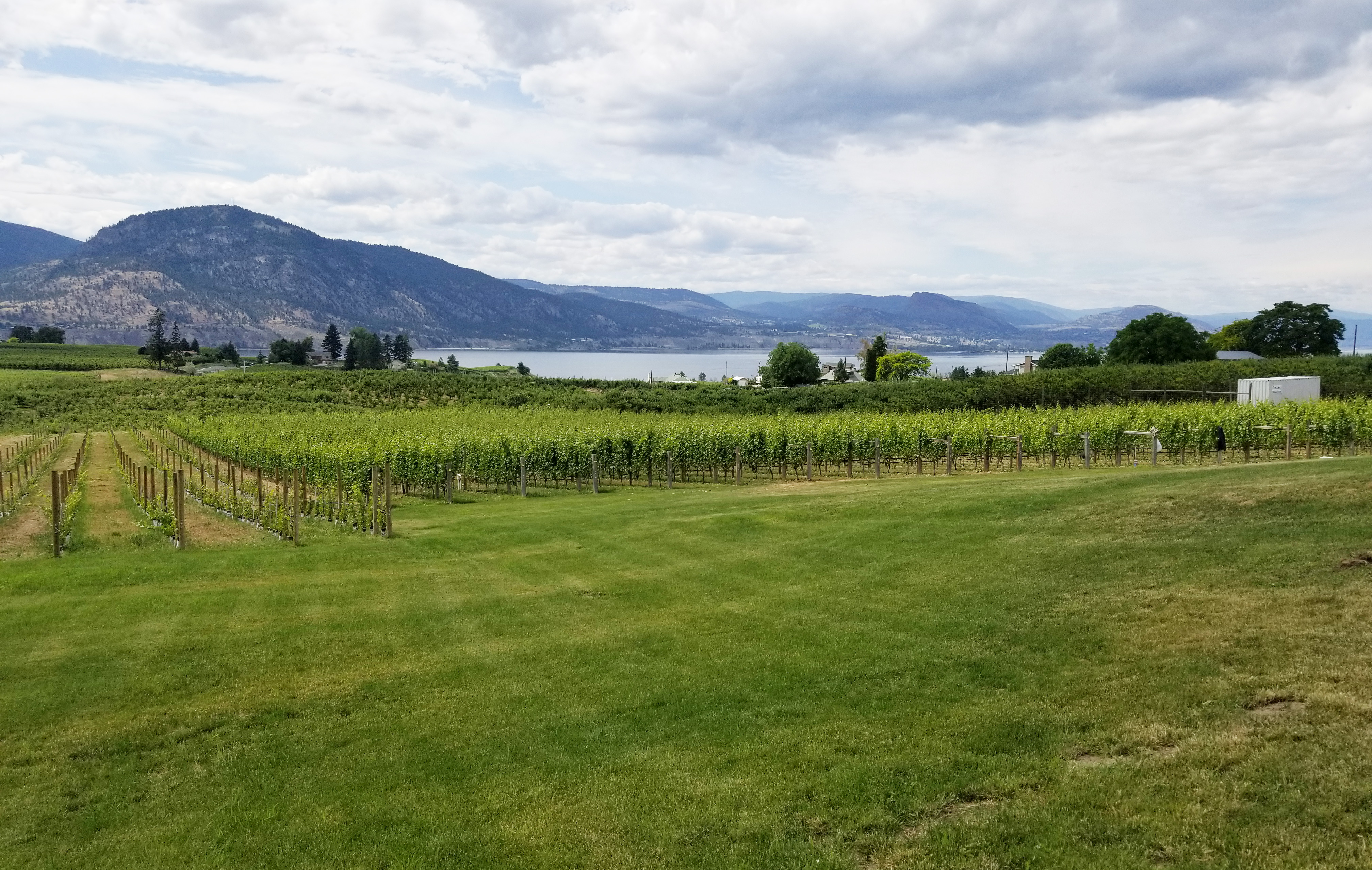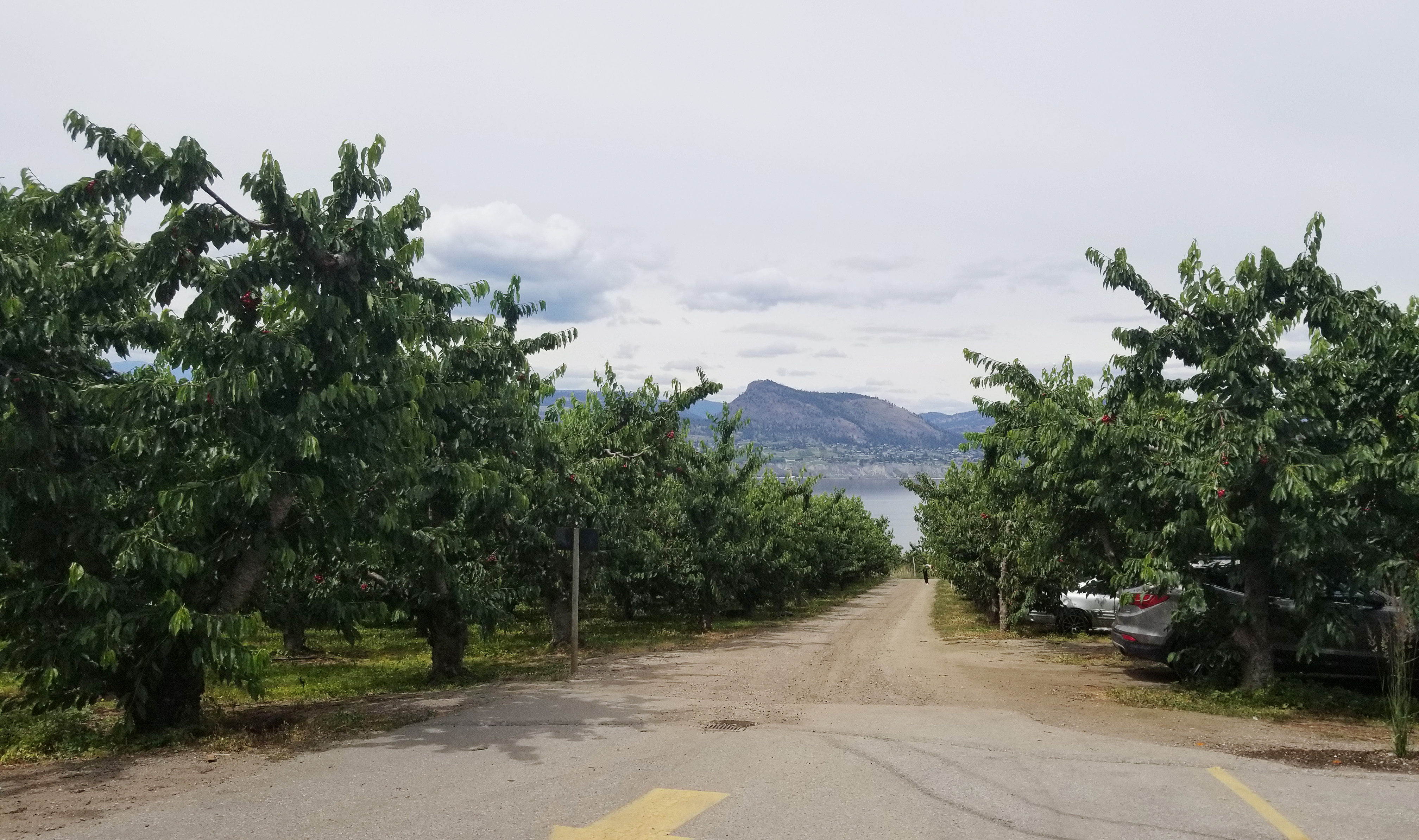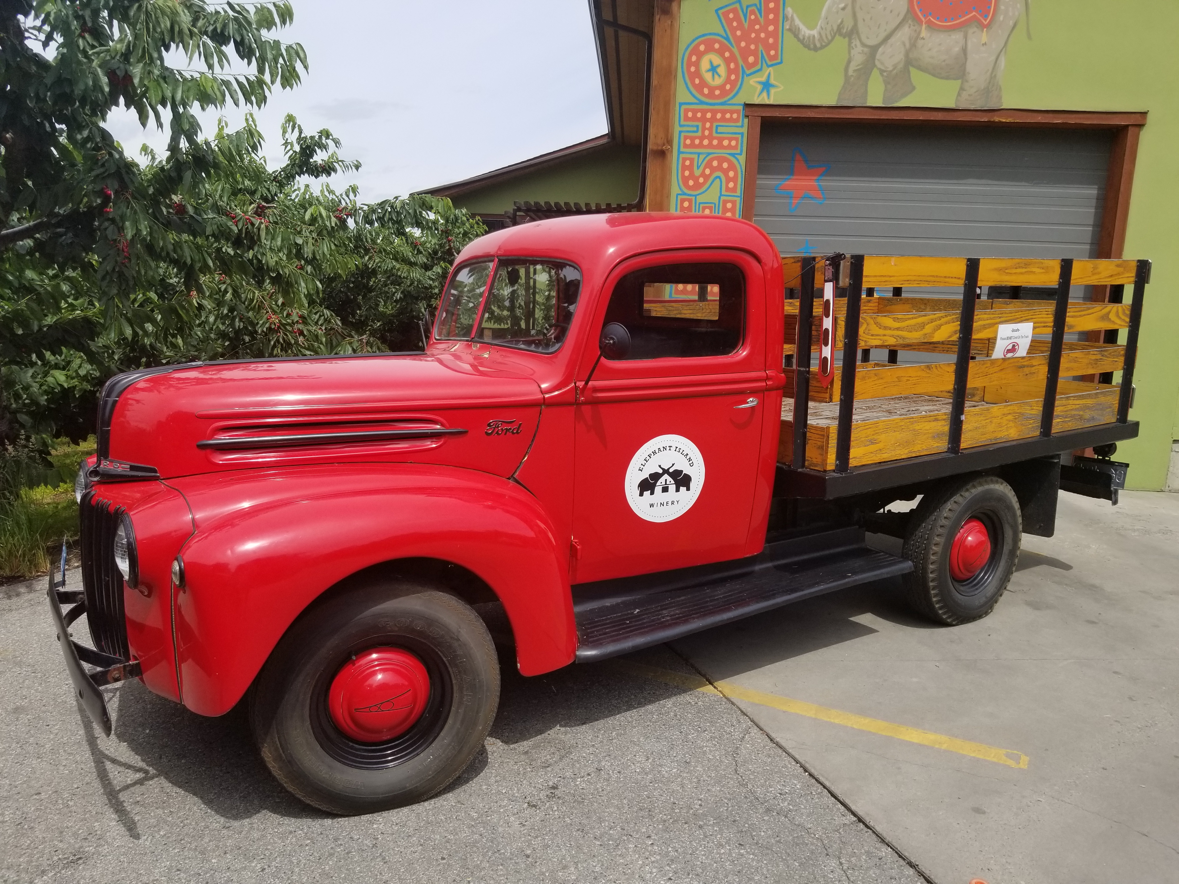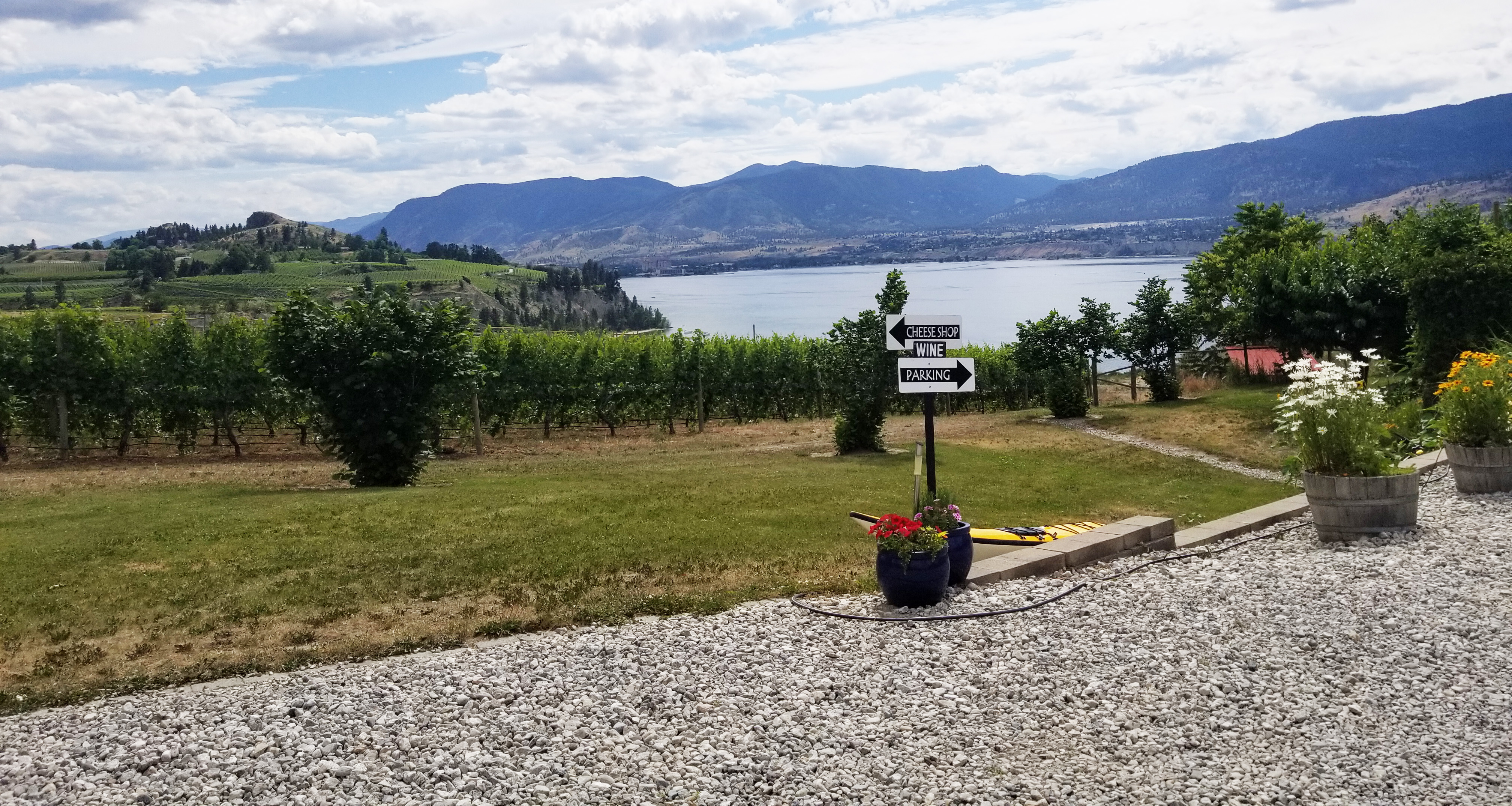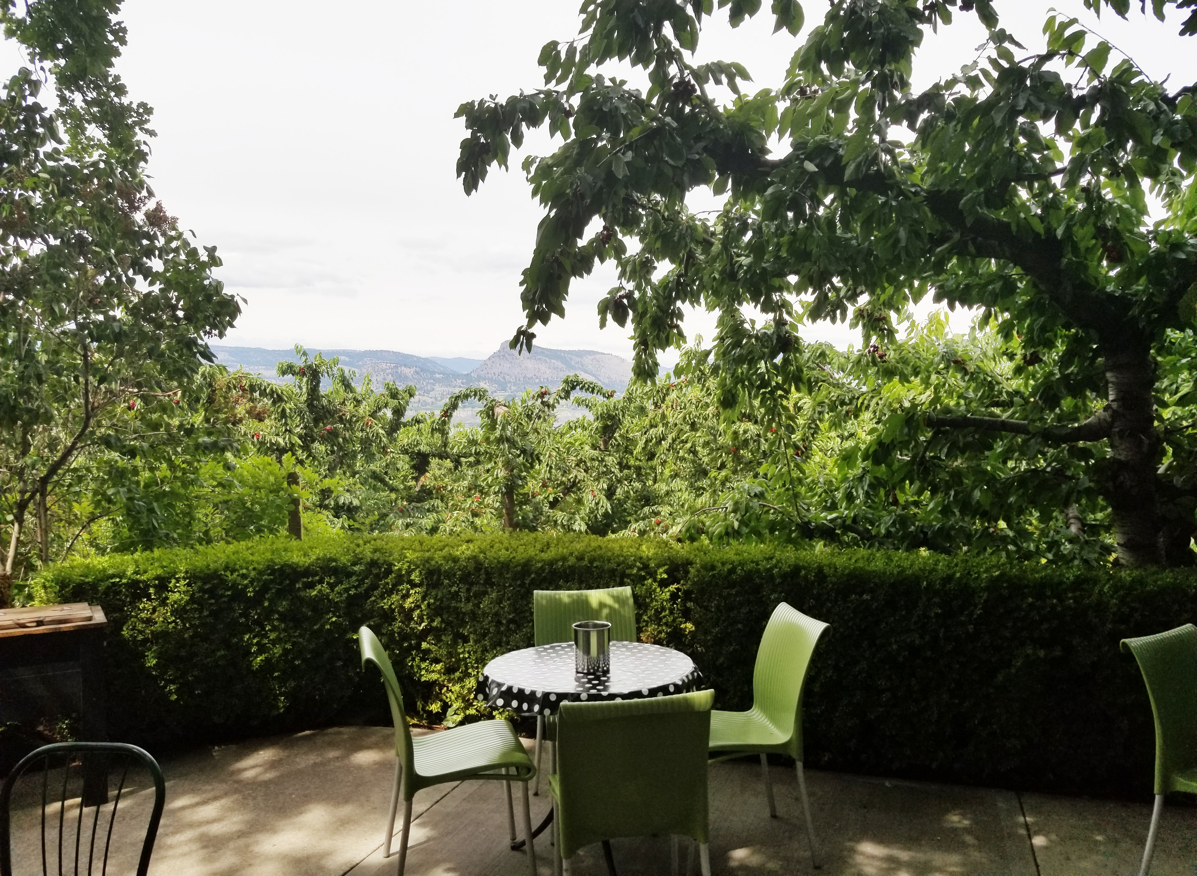 After passing through the busy little city of Penticton around 11 a.m., we made our way up towards Naramata Bench. The sky was still a bit cloudy, but clearing up bit by bit, leaving us with a lovely breeze, when we arrived at our first stop of the day: Elephant Island Winery. We turned into the driveway and made our way up the hill among a thick cherry orchard, all ripe with big red cherries. I may have “tested” one or two along the way.