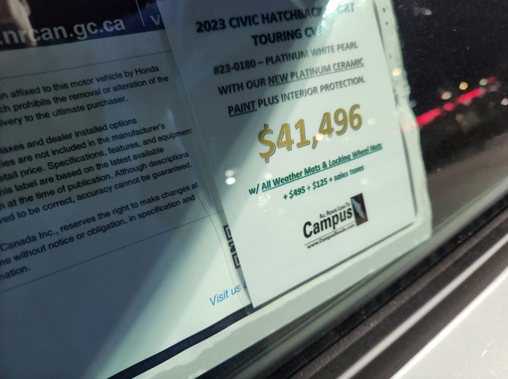 This one is my favourite. Look at any MSRP sheet on a new car at a dealership; it will have a breakdown of what the costs are – any federal or provincial fees, environmental taxes, and… freight. In the past (talking less than eight years ago) that used to be anywhere between $200 and $500, depending on the vehicle and the dealer. So of course, I couldn’t believe my eyes when I saw a whopping $1,950, ON TOP of an already inflated MSRP sticker on a 2023 Subaru Crosstrek.