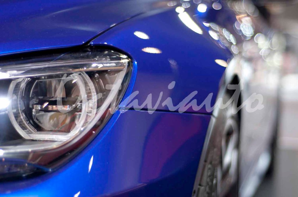 Front-end of a modern BMW sedan at an auto show.