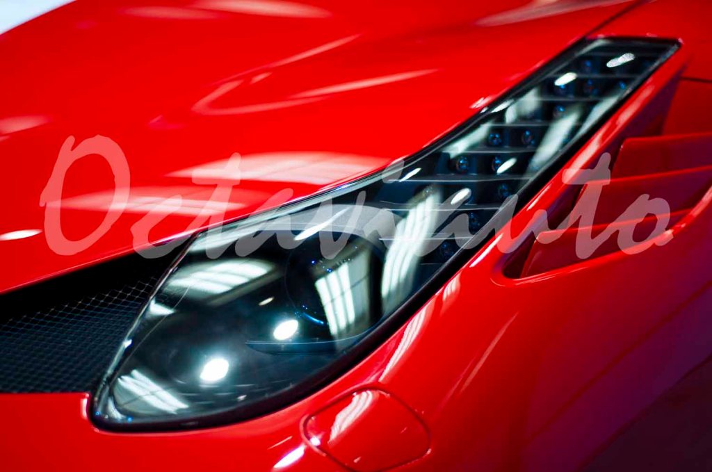 Front-end of a Ferrari 458 Italia at an auto exhibit.