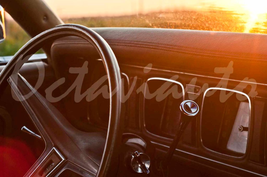 Interior shot of a Lincoln Mark III. Notice the faux-leather dashboard wrap, glass and steel accents around the instrumentation.